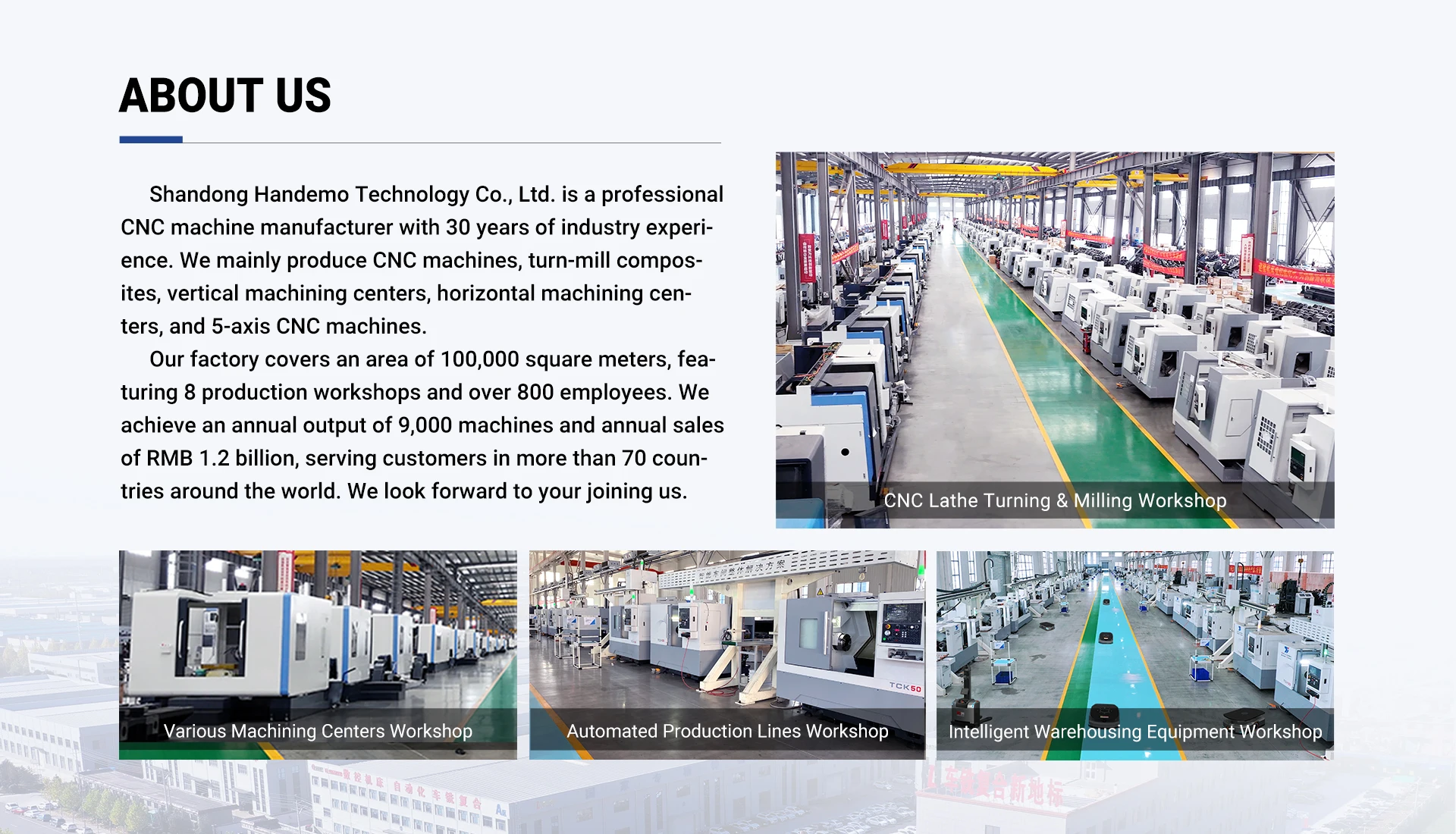 Shandong Handemo Technology Co., Ltd. is a manufacturer of CNC machine tools, turning and milling machines, vertical milling machines, horizontal milling machines, five-axis gantry machining centers and horizontal boring and milling machines. The factory covers an area of 100,000 square meters, has 6 production workshops and 600 employees. In 2024, the annual output of 8,000 units of equipment will reach 1 billion yuan in sales.